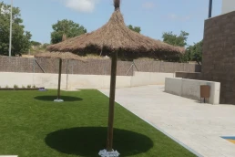 Els nostres para-sols estan elaborats de manera artesanal amb bruc natural. Es compon d’un pal rodó tractat per a exterior amb autoclau i una estructura metàl·lica a la qual se li sobreposa un mantell de bruc fixat amb filferro.